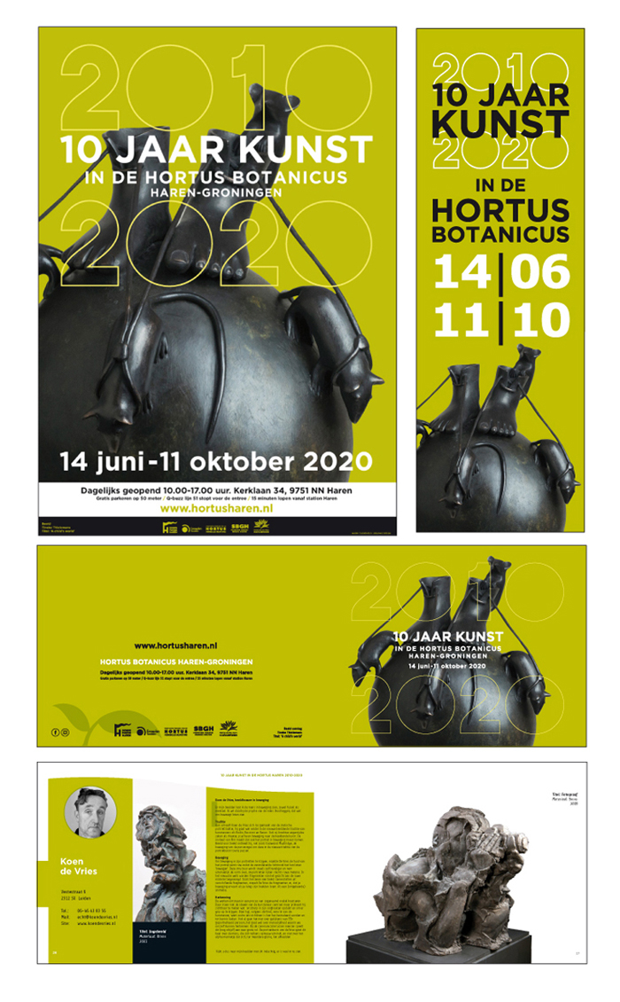 Vormgeving/ontwerp van vlag, banner, flyer, brochure, bestanden social media, advertentiemateriaal etc. t.b.v tentoonstelling: 2010-2020 10 JAAR KUNST IN DE HORTUS HAREN. Deze vind plaats in de tuinen van de groste hortus van nederland: de Hortus botanicus Haren.